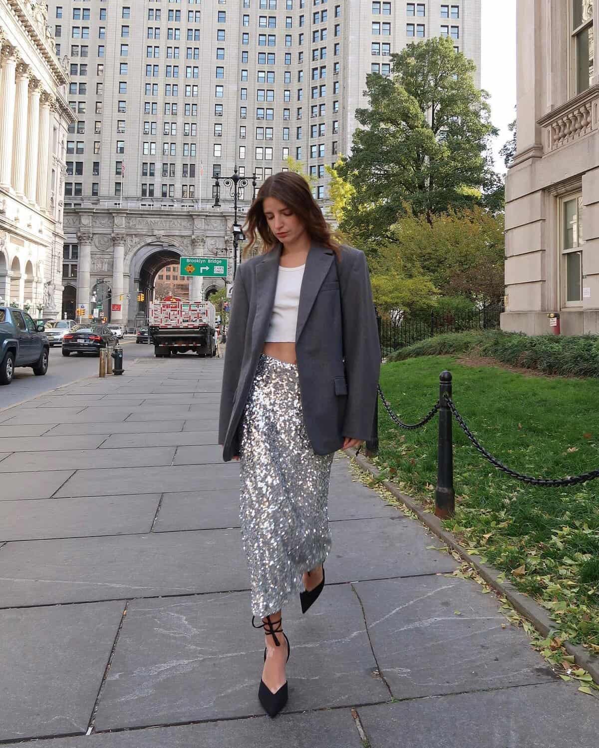 Elevate your fall party look with this stunning combination of glamour and sophistication. The dazzling sequin skirt catches the light and adds a festive touch, perfect for any autumn soirée. Balanced by a chic oversized gray blazer, this outfit seamlessly blends casual and formal elements. The crop top adds a modern edge, while black pointed-toe heels elongate the silhouette. This ensemble is ideal for transitioning from day to night, allowing you to make a statement at any fall gathering. The mix of textures and the play between sparkle and muted tones create a head-turning look that’s both seasonally appropriate and fashion-forward.
