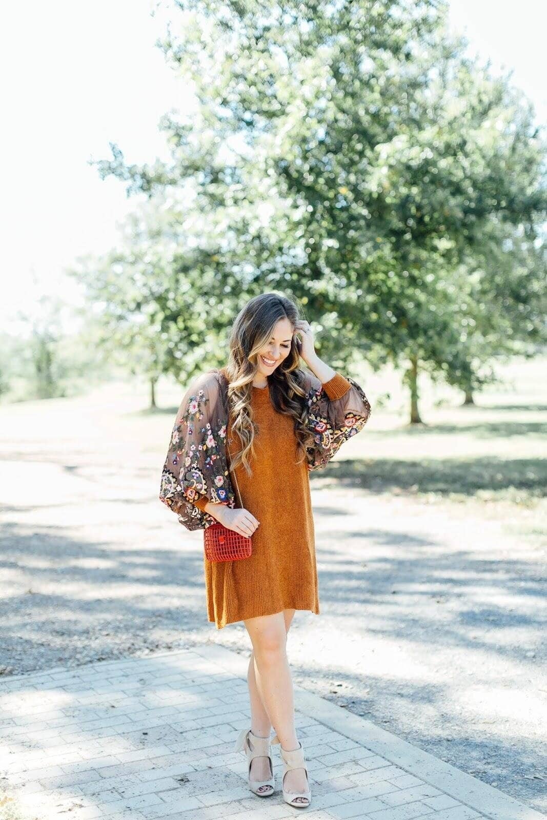 This enchanting fall party outfit combines comfort and style effortlessly. The rust-colored sweater dress serves as the perfect canvas for the standout feature: billowy floral sleeves that add a touch of whimsy and romance. The rich autumnal hue of the dress complements the season’s palette, while the floral pattern introduces a playful contrast. Paired with neutral wedge sandals and a vibrant red clutch, this ensemble strikes the ideal balance between casual and chic. It’s versatile enough for various fall gatherings, from outdoor picnics to indoor soirées. The flowing silhouette and warm tones make it a head-turning choice that embodies the spirit of fall fashion.