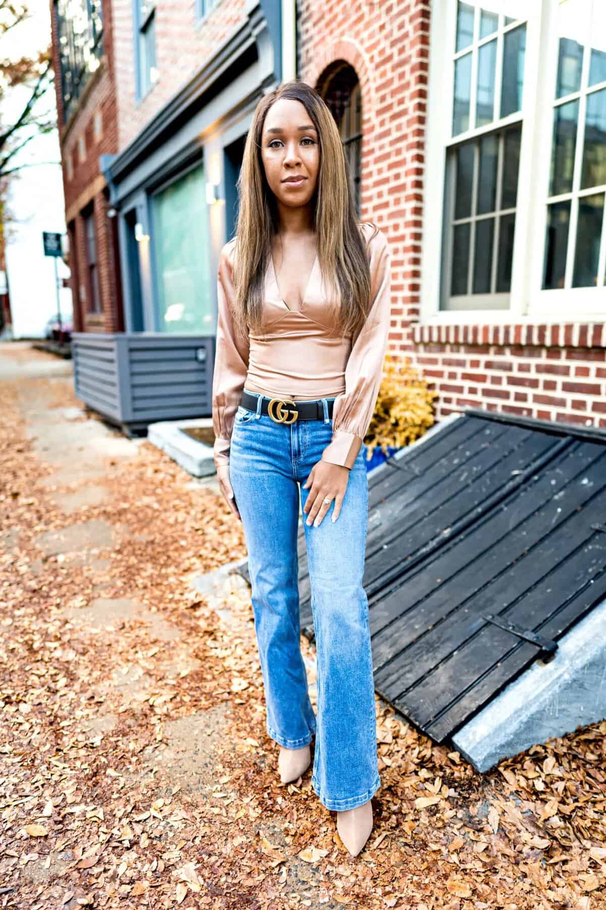 Elevate your fall party style with this effortlessly chic combination of luxe and casual. The blush silk top with its plunging neckline and billowy sleeves adds a touch of sophistication, while the classic blue jeans keep the look grounded and versatile. The designer belt cinches the waist, creating a flattering silhouette and adding a hint of glamour. Paired with nude pumps, this outfit strikes the perfect balance between dressed-up and relaxed, making it ideal for a range of autumn soirées. It’s a testament to how mixing textures and balancing proportions can create a head-turning ensemble that’s both fashionable and comfortable for those crisp fall evenings.