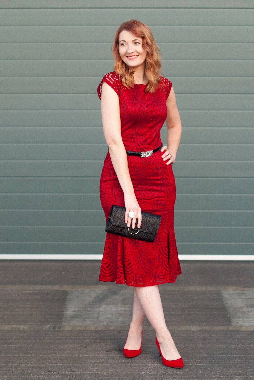 Make a bold statement at your fall soirée with this stunning red lace midi dress. The intricate pattern adds depth and sophistication, while the vibrant hue demands attention. The fitted silhouette with a flared hem creates a flattering shape for any body type. Accessorized with a slim belt to accentuate the waist, matching red pumps for a cohesive look, and a chic black clutch for contrast, this ensemble embodies autumn elegance. The cap sleeves offer just the right amount of coverage for cooler evenings, making it a perfect choice for autumn gatherings. This head-turning outfit combines timeless style with seasonal flair, ensuring you’ll be the belle of any fall party.