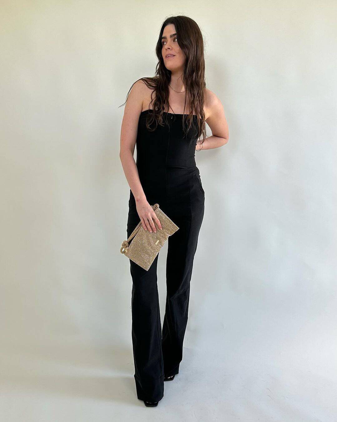 Elevate your fall party style with this stunning black strapless jumpsuit that exudes sophistication and glamour. The sleek silhouette hugs the body in all the right places, creating a long, lean look that’s perfect for any festive occasion. The wide-leg pants add a touch of drama and movement, while the fitted bodice ensures a flattering fit. Accessorized with a glittering gold clutch, this ensemble strikes the perfect balance between elegance and edginess. The minimalist design allows for versatile styling options – dress it up with statement jewelry for a formal event or keep it simple for a chic cocktail party. This timeless piece is a must-have for your fall wardrobe, guaranteed to turn heads and make a lasting impression.
