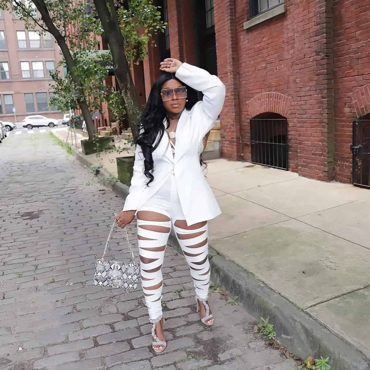 This striking all-white outfit is perfect for making a bold statement at any fall party. The ensemble features a chic white blazer paired with unique strappy leggings that add an edgy twist to the classic monochrome look. The blazer’s tailored silhouette creates a polished appearance, while the cut-out details of the leggings offer a daring contrast. Accessorized with oversized sunglasses, a statement necklace, and a snakeskin-print handbag, this outfit effortlessly combines sophistication with avant-garde style. The look is completed with strappy white sandals, making it an ideal choice for those warmer autumn evenings or indoor events where you want to turn heads and showcase your fashion-forward sensibilities.