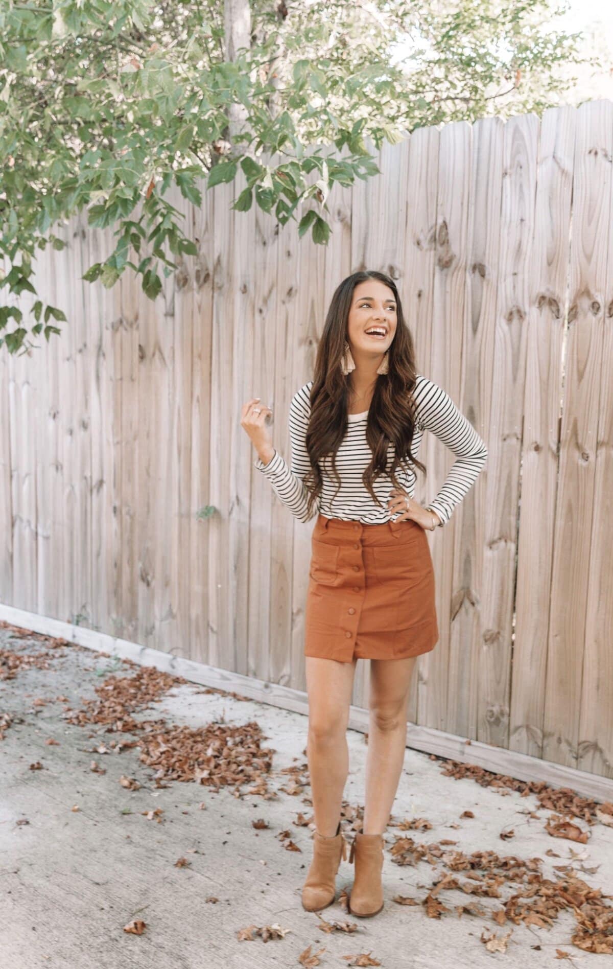 This effortlessly stylish ensemble perfectly captures the essence of fall fashion. A classic striped long-sleeve top paired with a burnt orange button-front skirt creates a harmonious balance between casual and chic. The warm, earthy tone of the skirt evokes the changing leaves of autumn, while the striped top adds a timeless nautical flair. Complemented by matching ankle boots and statement earrings, this outfit is versatile enough for various fall festivities. Whether you’re attending a casual outdoor gathering or a more upscale autumn soirée, this look offers comfort without compromising on style. The combination of patterns and solid colors makes for an eye-catching ensemble that’s sure to turn heads at any fall party.