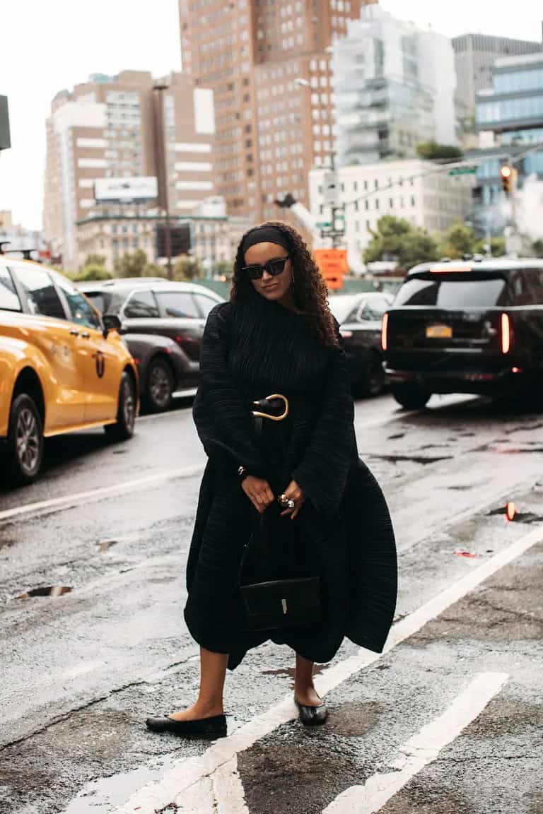 This stunning all-black ensemble epitomizes fall fashion sophistication. The oversized sweater dress, cinched with a statement gold belt, creates a flattering silhouette while providing warmth for cooler autumn days. The voluminous sleeves and midi length add drama and elegance to the look. Paired with sleek black flats and a matching handbag, this monochromatic outfit exudes urban chic. The addition of dark sunglasses and gold accessories elevates the ensemble, making it perfect for a variety of fall events, from casual brunches to upscale parties. This look demonstrates how a single-color outfit can be both striking and versatile, ideal for making a memorable impression at any autumn gathering.