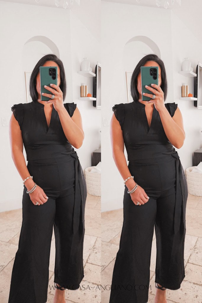 For a sophisticated fall party look that exudes timeless elegance, this sleek black jumpsuit is an absolute showstopper. The plunging V-neckline adds a touch of allure, while the wide-leg silhouette offers both comfort and style. The cinched waist with a tie detail accentuates the figure, creating a flattering silhouette for any body type. Paired with statement jewelry and strappy heels, this versatile piece can easily transition from a daytime event to an evening soirée. The jumpsuit’s simplicity allows for endless accessorizing options, making it a perfect canvas for showcasing your personal style at any autumn gathering.