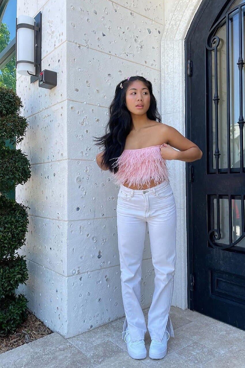 Make a bold statement at your fall party with this eye-catching combination of a pink feathered crop top and crisp white jeans. The playful texture of the feathered top adds a touch of glamour and whimsy, perfect for those who want to stand out from the crowd. The contrast between the soft pink and stark white creates a visually striking look that’s both fun and fashionable. Paired with white sneakers, this outfit strikes the perfect balance between casual comfort and party-ready style. It’s an ideal choice for those warmer fall days or indoor events where you want to make a lasting impression without sacrificing comfort.