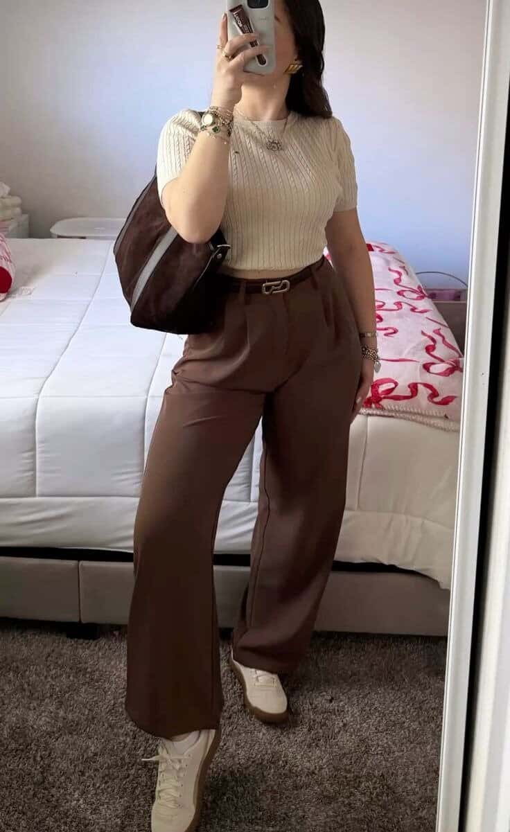 Elevate your campus style with this sophisticated cream and brown combination. The outfit features a fitted cream ribbed top paired with high-waisted brown trousers, creating a sleek silhouette perfect for fall. The neutral color palette offers versatility while exuding elegance. Accessorized with a matching brown belt, gold jewelry, and a spacious brown tote, this look seamlessly blends comfort and fashion. White sneakers add a casual touch, making it ideal for long days of lectures and study sessions. This ensemble proves that you can look polished and put-together without sacrificing comfort, making you stand out as a true style icon on campus.