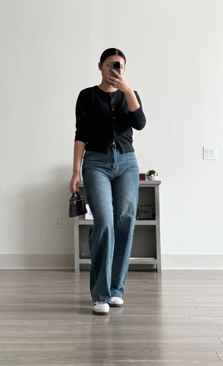 This timeless ensemble perfectly balances comfort and style for those crisp fall days on campus. The black cardigan adds a touch of sophistication while keeping you cozy during chilly lectures. Paired with relaxed wide-leg jeans, this outfit offers both flexibility and a trendy silhouette that’s ideal for navigating busy college life. The white sneakers provide a casual touch, ensuring comfort during long walks between classes. Accessorized with a small black handbag, this look is not only practical but also effortlessly chic, making it a go-to choice for fashion-forward students aiming to make a statement without sacrificing comfort.