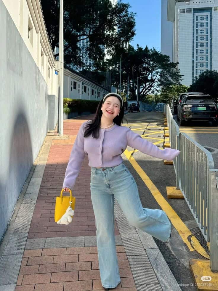 Embrace the perfect blend of comfort and style with this trendy fall ensemble. The soft lavender cardigan adds a touch of warmth and femininity, while the light-wash wide-leg jeans offer a relaxed yet fashionable silhouette. Accessorized with a vibrant yellow handbag and a playful hair accessory, this outfit exudes confidence and charm. The combination of pastel hues and denim creates a versatile look that’s ideal for navigating campus life, from lectures to social gatherings. This outfit demonstrates how to effortlessly mix casual and chic elements, making it a must-have for any fashion-forward student looking to make a statement this fall semester.