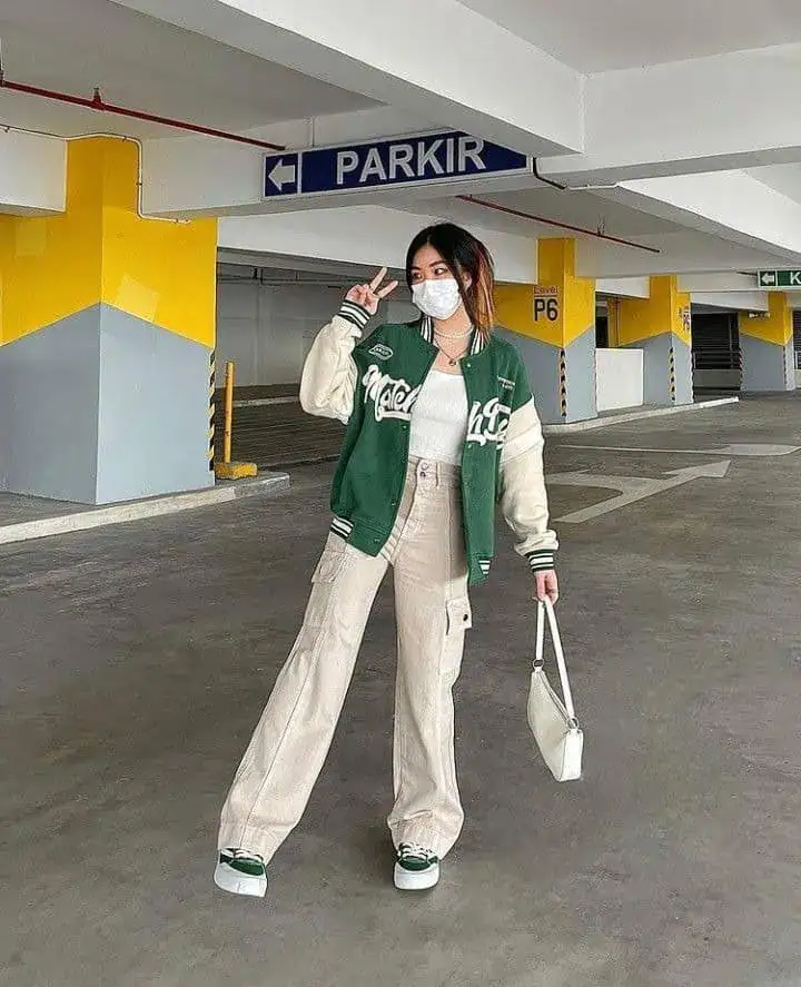 Kick off your campus style revolution with this perfectly balanced blend of athletic charm and utilitarian cool. The emerald green varsity jacket takes center stage, offering a pop of school spirit against neutral tones. Wide-leg cargo pants in a light hue provide comfort and practicality, while a cropped white top adds a touch of modern flair. Chunky sneakers complete the look, ensuring you’re ready for anything from lectures to impromptu hangouts. This outfit seamlessly merges sporty and street style elements, making it an ideal choice for those crisp fall days when you want to stand out in the campus crowd.