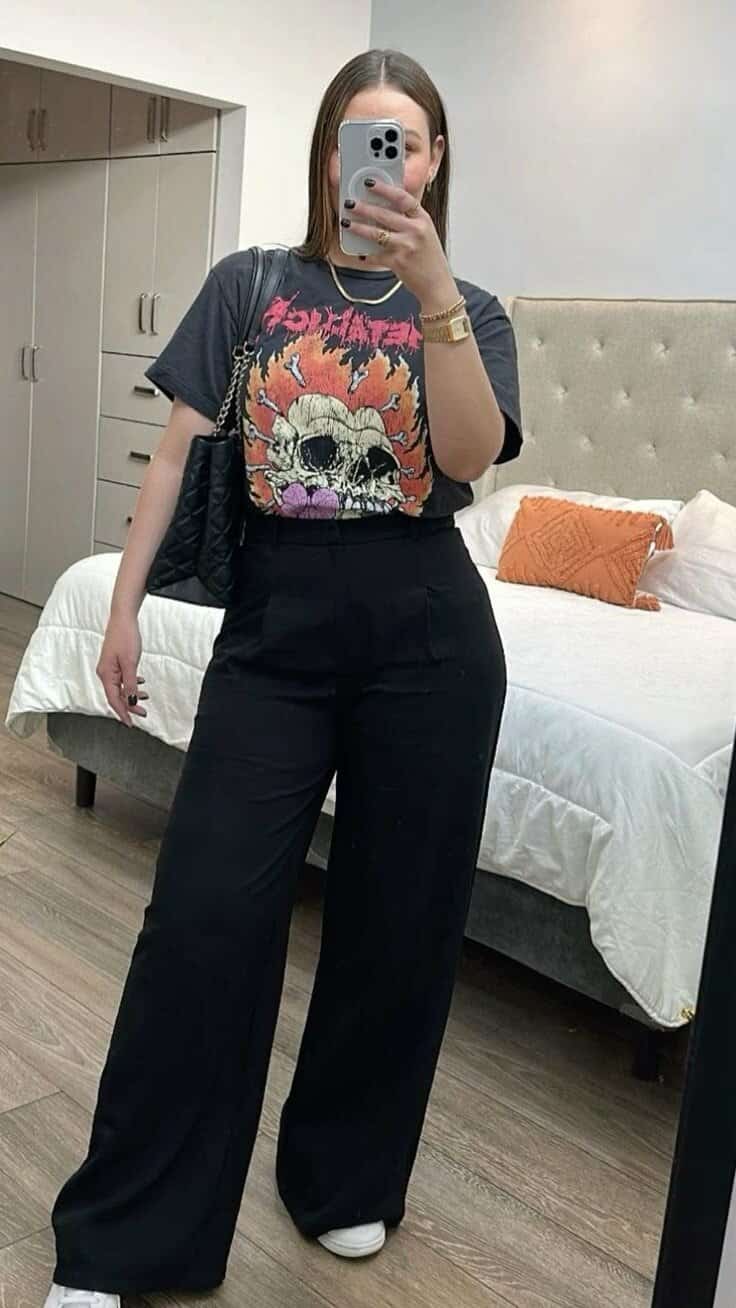 Make a bold statement on campus with this effortlessly cool combination of a vintage-inspired graphic tee and sleek wide-leg pants. The dark, eye-catching t-shirt featuring a fiery skull design adds an edgy flair to the outfit, while the high-waisted black trousers create a sophisticated silhouette. This ensemble strikes the perfect balance between casual and polished, ideal for transitioning from lectures to social gatherings. Accessorize with a quilted shoulder bag, chunky gold jewelry, and classic white sneakers to complete this trendsetting look. It’s a versatile outfit that showcases your unique style while maintaining comfort for those long days of classes and campus activities.