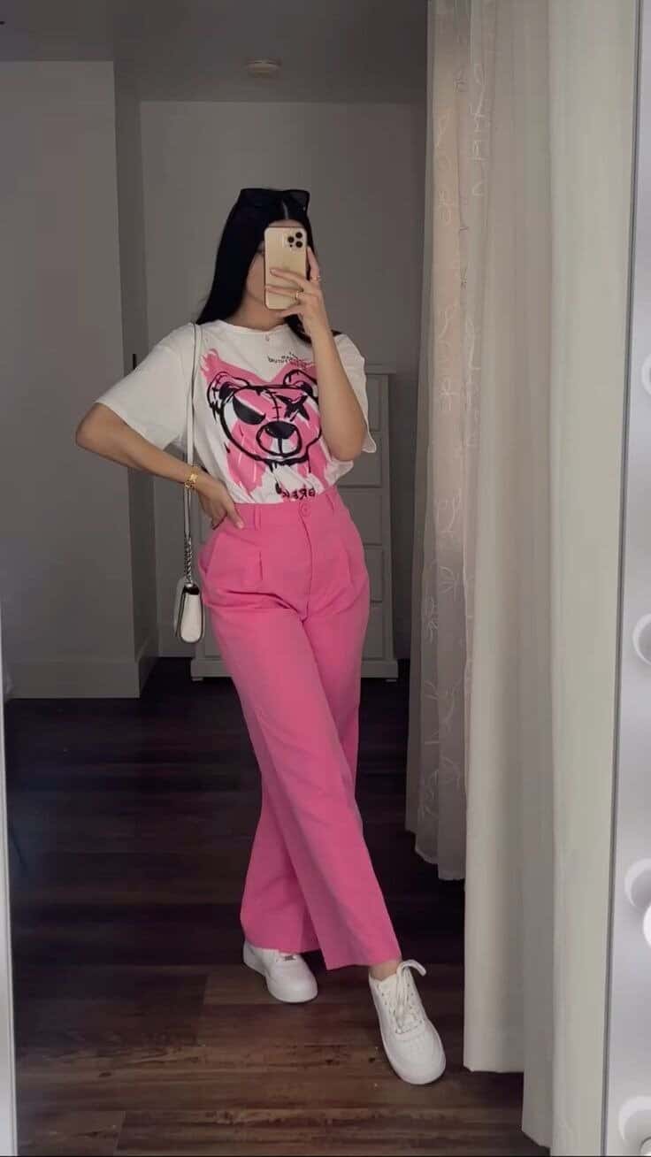 Make a bold statement on campus with this eye-catching ensemble that perfectly balances casual cool with trendy sophistication. The outfit centers around vibrant pink wide-leg trousers, creating a striking silhouette that’s both comfortable and stylish. Paired with a white graphic tee featuring a playful pink bear design, this look effortlessly combines whimsy with fashion-forward thinking. The contrast between the relaxed t-shirt and the more structured pants creates an interesting visual dynamic. Completed with clean white sneakers and a small shoulder bag, this outfit is ideal for navigating busy college days while maintaining that coveted style icon status. It’s a perfect example of how to incorporate fall’s pink trend into your school wardrobe with confidence and flair.