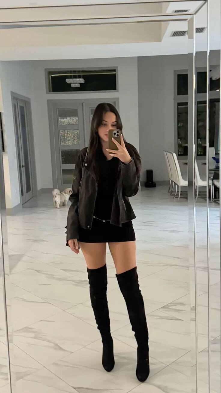 This fierce all-black ensemble exudes confidence and style, perfect for a night out on the town. The outfit combines a sleek black mini dress with a edgy leather jacket, creating a beautiful contrast of textures.