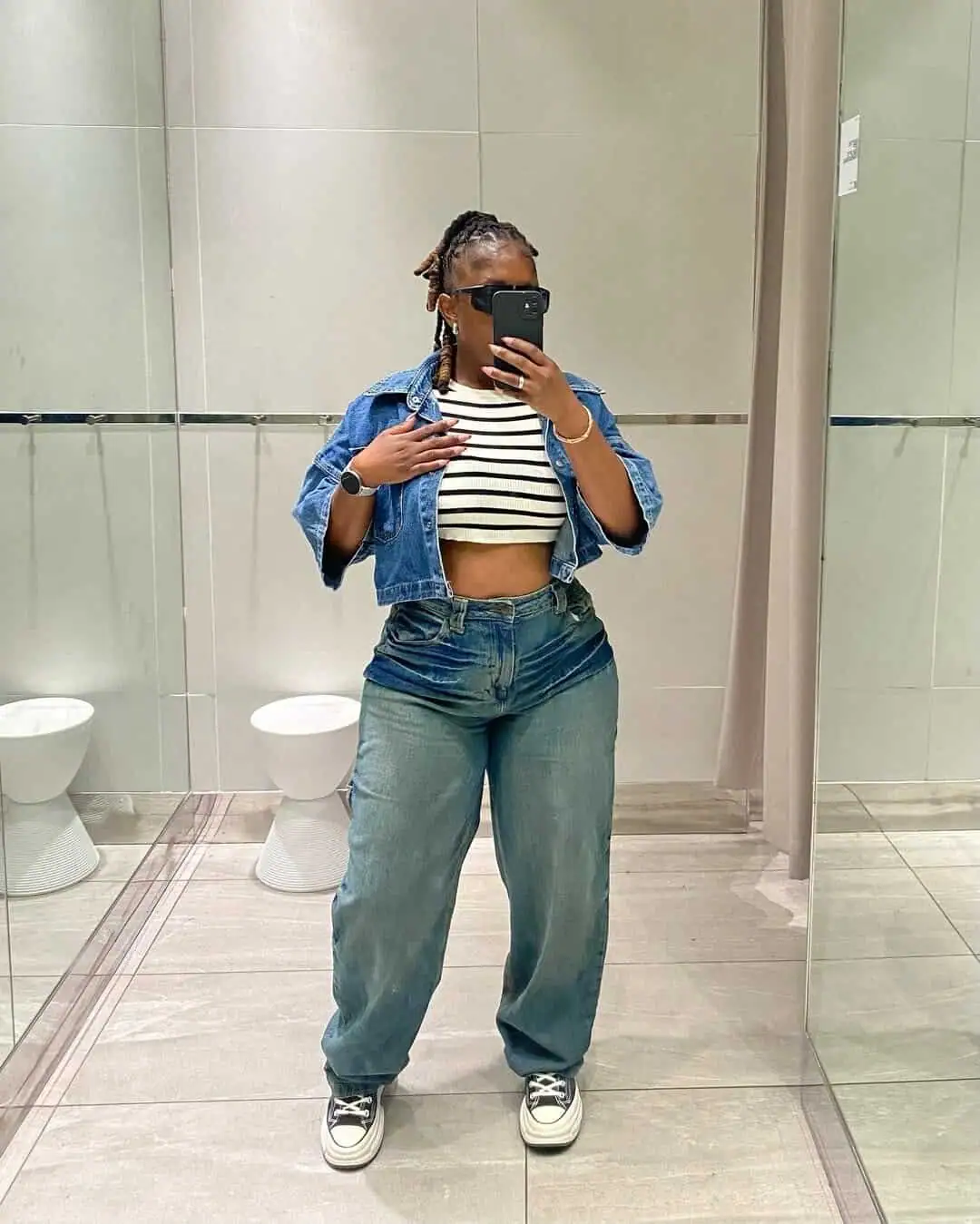 Embrace the ultimate Y2K vibe with this fierce double denim ensemble. The combination of a cropped denim jacket and baggy jeans perfectly captures the millenniums love for all things denim.