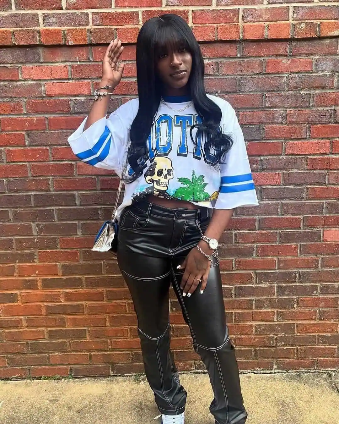The high-waisted leather pants with intricate lace-up details along the sides create a sleek silhouette, while the cropped button-up shirt adds a touch of sass. Completed with long, flowing blonde hair and minimalist accessories, this ensemble perfectly captures the essence of Y2K fashion for Black women who want to make a statement.