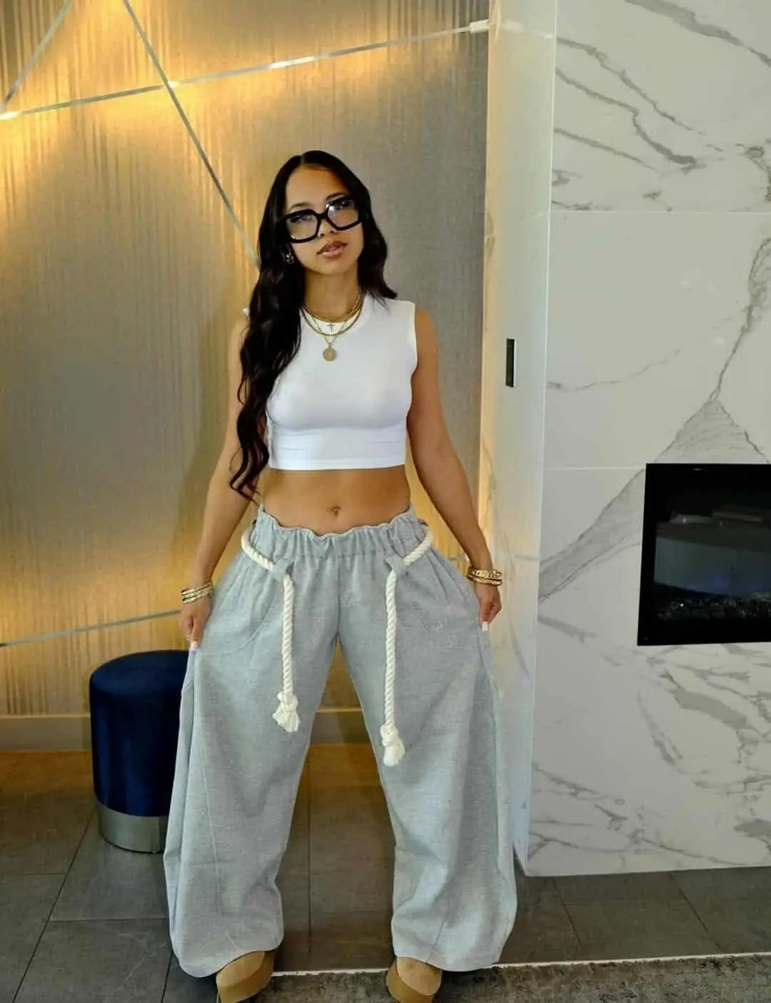 Channeling the ultimate Y2K vibe, these oversized sweatpants with eye-catching rope accents are a must-have for any millennial fashion revival. The relaxed fit and light gray color offer versatility, while the nautical-inspired rope details add a unique twist to this comfy-chic look.