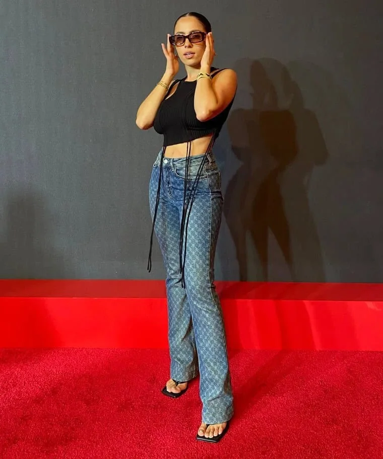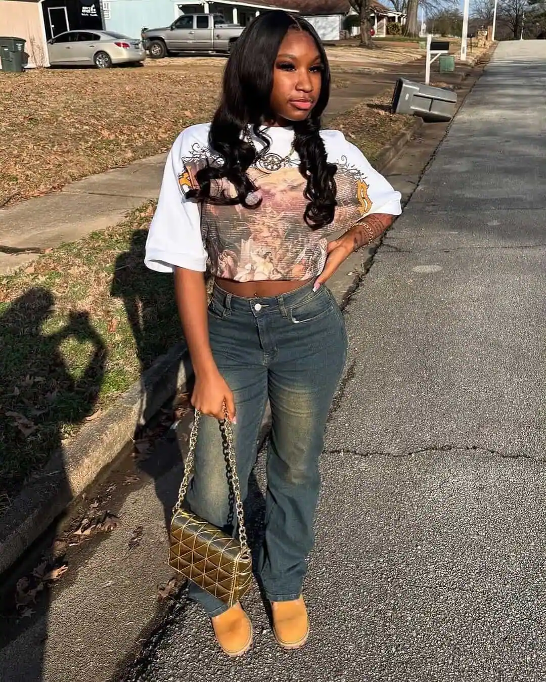 Reviving the Y2K era with a modern twist, this ensemble perfectly captures the essence of millennium fashion for Black women. The sleek black crop top with its daring cut and string details exudes confidence, while the high-waisted printed denim jeans add a touch of playful sophistication.