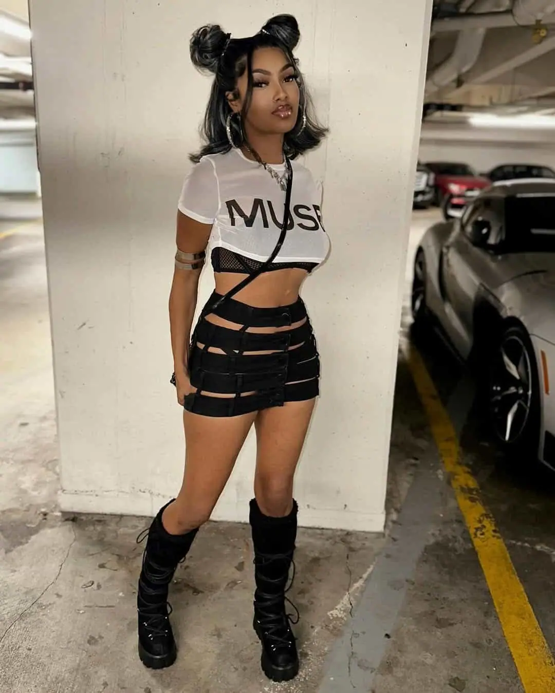 Embrace the daring spirit of Y2K fashion with this bold ensemble featuring a white crop top emblazoned with MUSE and an ultra-revealing black cut-out skirt. This look perfectly encapsulates the millenniums penchant for showing skin and pushing boundaries.