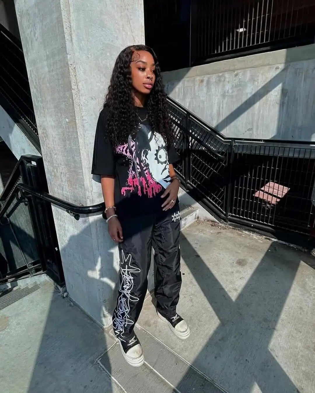 Embrace the urban edge of Y2K fashion with a combo that screams millennium cool. The oversized graphic tee featuring bold prints and vibrant colors paired with sleek black pants adorned with graffiti-inspired designs captures the essence of street style from the era.