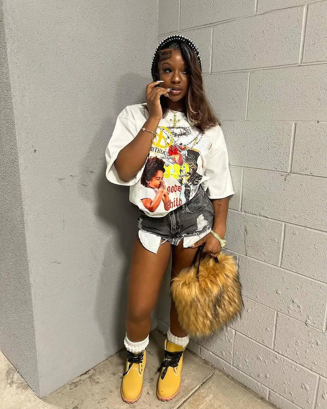 The oversized white t-shirt featuring vibrant imagery and text adds a pop of personality, while the frayed denim shorts provide that effortlessly cool vibe. Accessorize with a pearl-embellished headband, chunky yellow boots, and a furry handbag to complete the look.