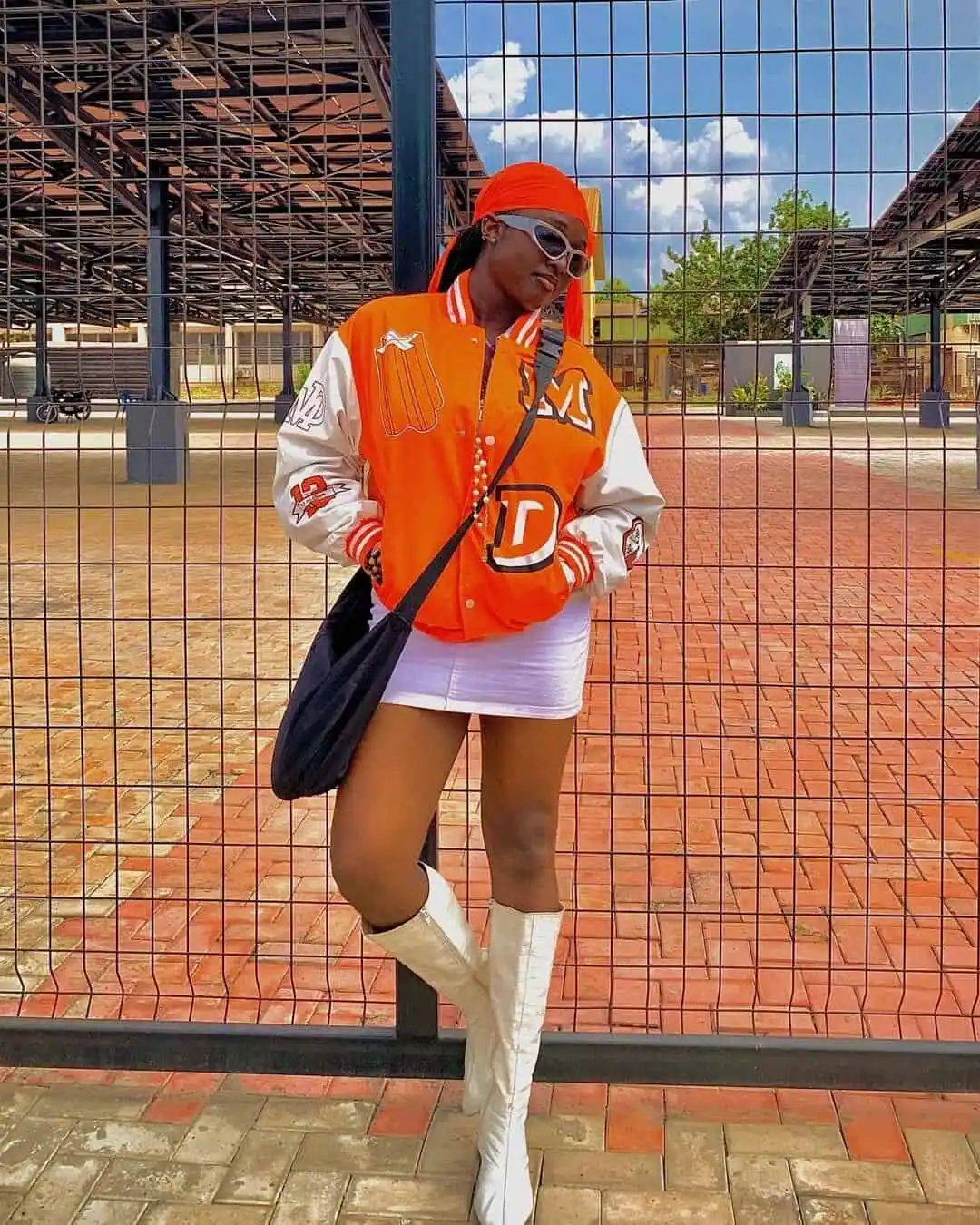 Slay the Y2K comeback with this eye-catching combo of a bright orange varsity jacket and matching headwrap. This look screams millennium confidence and campus cool.