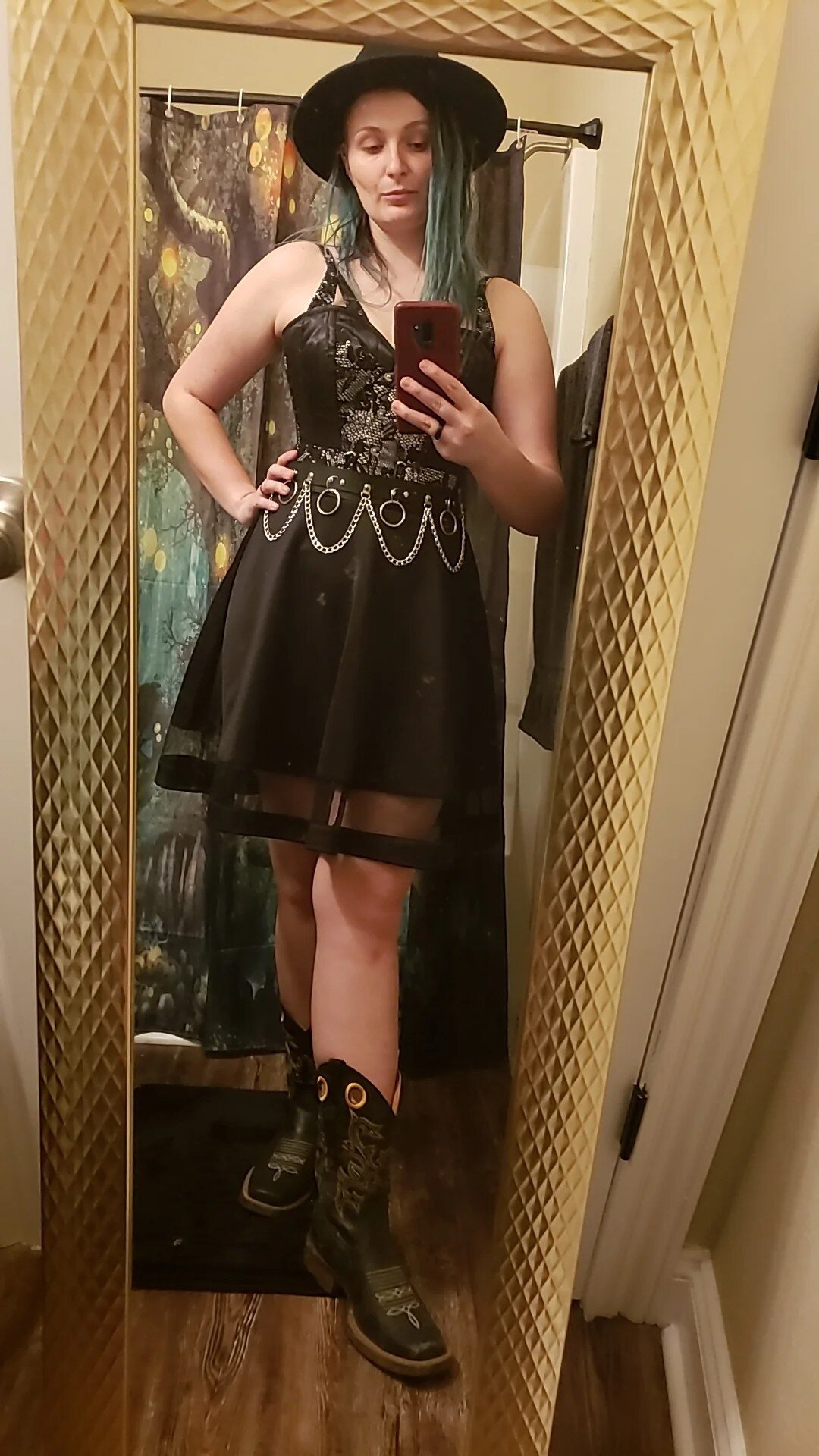 This outfit works beautifully for evening events, ranch parties, or anyone seeking to balance delicate goth sensibilities with rugged western charm in an effortlessly cool way.