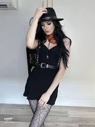 The addition of patterned stockings and a structured belt elevates the ensemble, adding visual interest and dimension to the minimalist base. This versatile combination works wonderfully for themed events, alternative fashion statements, or anyone wanting to explore the intersection of dark romance and western culture.