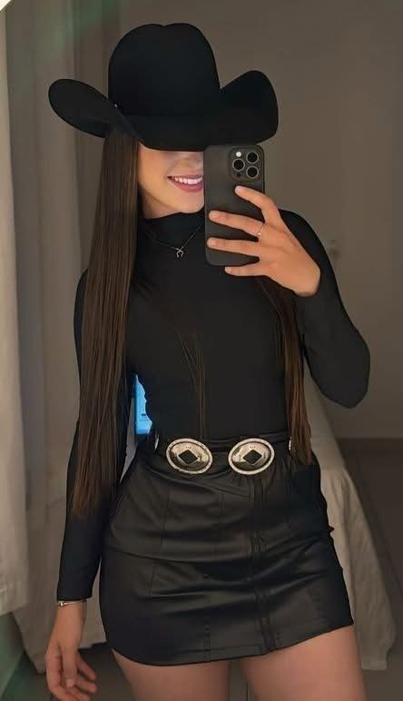 The standout feature is the ornate statement belt with large circular buckles, which adds an edgy, alternative edge to traditional western wear. Paired with a sleek black leather mini skirt, this look masterfully blends gothic aesthetics with cowgirl attitude.