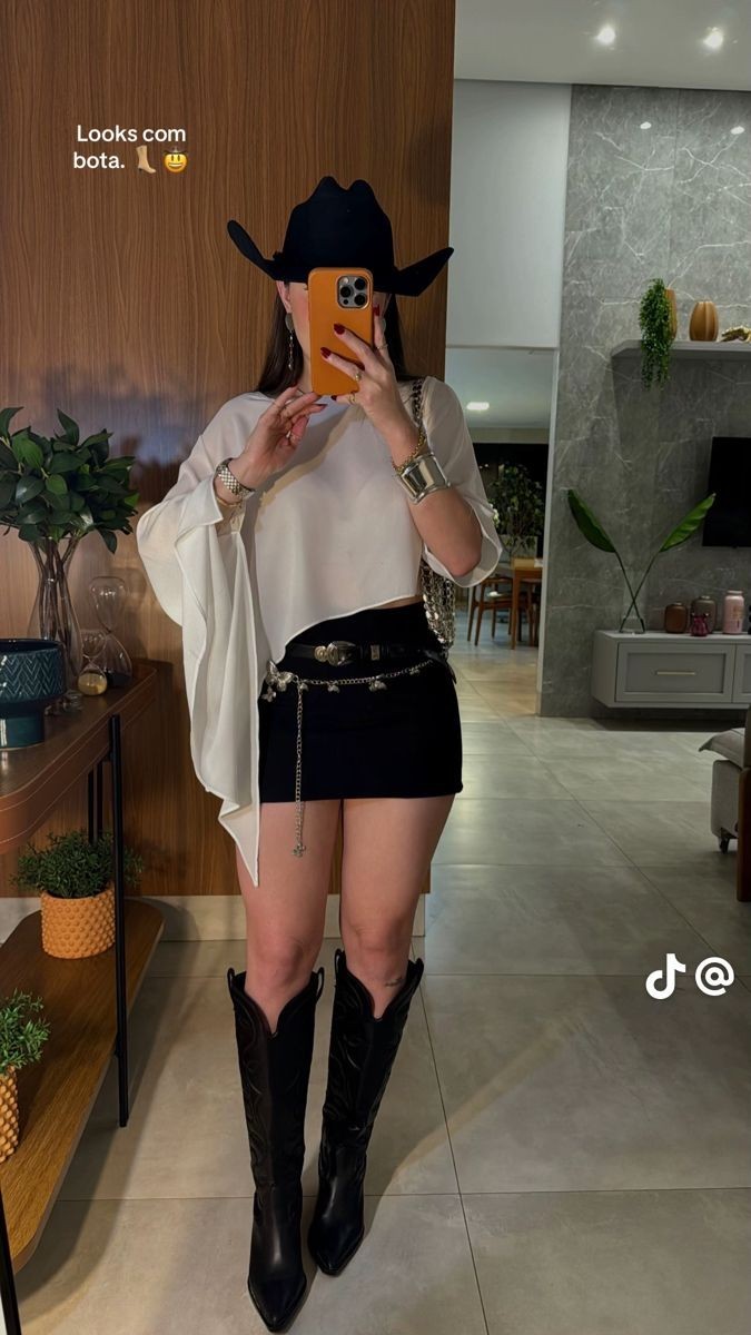 This striking combination perfectly captures the goth cowgirl aesthetic by pairing a flowing cream-colored blouse with a sleek black mini skirt and ornate chain belt. The oversized, draped cream top provides an elegant, ethereal quality while the structured black mini skirt grounds the look with edgy sophistication.