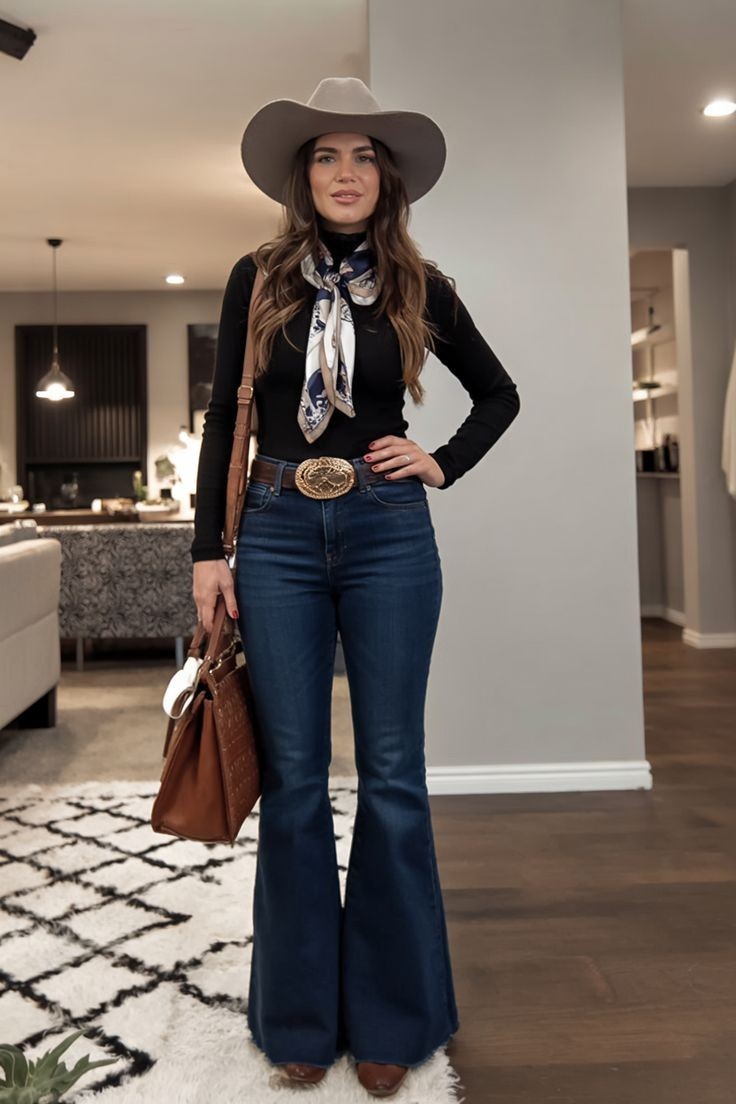 This outfit perfectly captures the goth cowgirl aesthetic by pairing a sleek black long-sleeve bodysuit with classic dark-wash flare jeans and a cream Stetson hat. The white patterned bandana tied at the neck adds a romantic, vintage Western flair while maintaining the gothic sensibility.