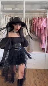 This striking ensemble perfectly captures the essence of goth cowgirl aesthetic by layering a dramatic black tulle skirt with voluminous ruffled details and a fitted black corset-style top. The addition of statement black cowboy boots grounds the look in Western tradition while maintaining the gothic edge.