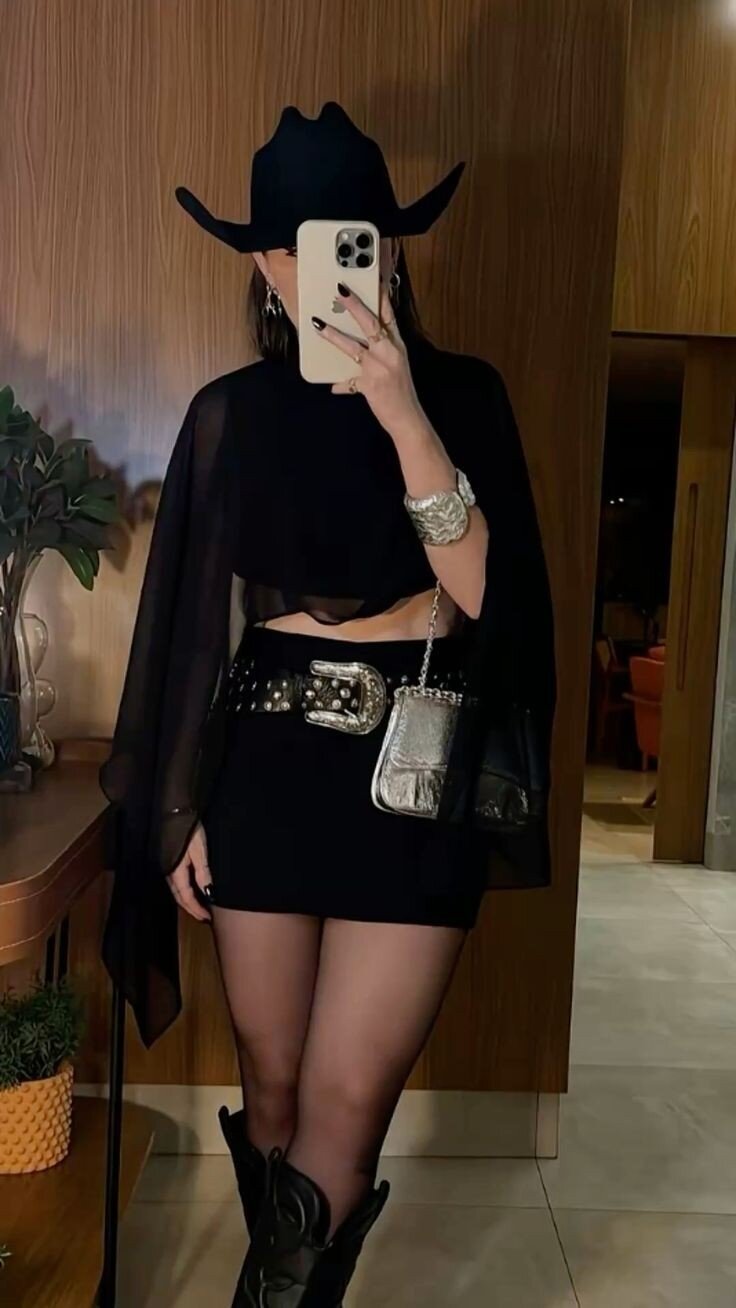 This outfit demonstrates how layering statement pieces can transform a basic black ensemble into a bold, fashion-forward goth cowgirl look that”s perfect for making an unforgettable impression at any venue or event where you want to showcase your unique style sensibility and rebellious spirit.