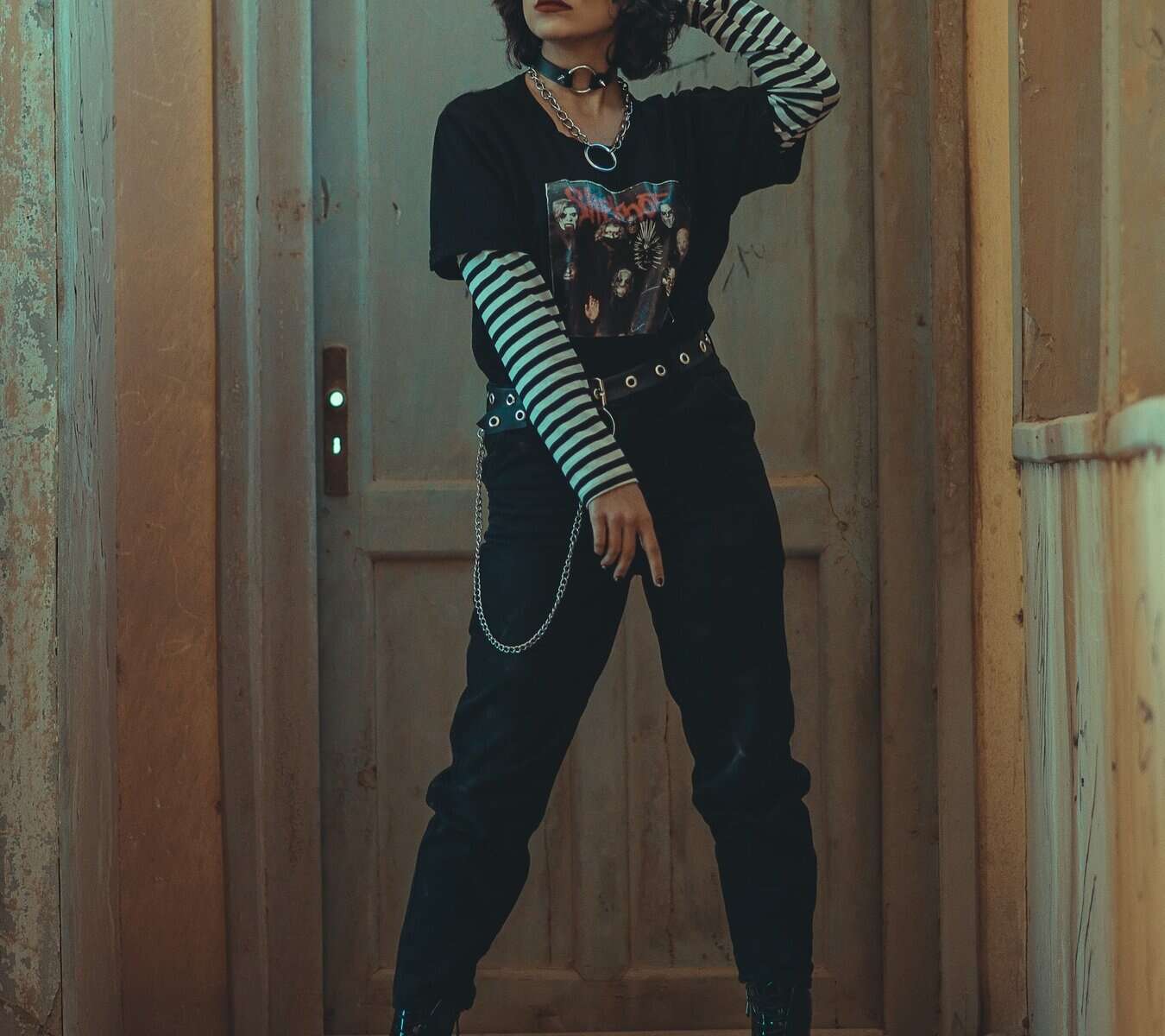 This hauntingly beautiful fall goth outfit perfectly embodies the spirit of the season with its grunge-inspired layering and edgy accessories. The ensemble features a black band tee adorned with a striking graphic, layered over a striped long-sleeve shirt for added visual interest and warmth. The look is completed with sleek black pants, a studded belt, and an eye-catching chain accessory. A chunky chain choker adds a touch of rebellious charm, while the overall silhouette remains slim and elongated. This outfit seamlessly blends classic goth elements with contemporary street style, making it an ideal choice for those seeking to make a bold statement this autumn.