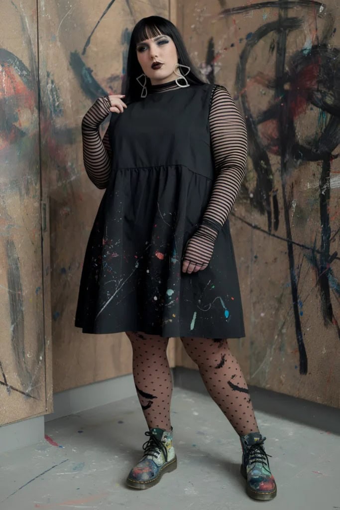This hauntingly beautiful fall goth outfit perfectly embodies the intersection of dark aesthetics and artistic expression. The ensemble centers around a black babydoll dress adorned with vibrant paint splatters, creating an eye-catching contrast against the somber backdrop. Paired with sheer polka dot tights featuring bat motifs, the look exudes a playful yet macabre charm. The striped long-sleeved undershirt adds depth and texture, while colorful, paint-splashed combat boots tie the artistic theme together from head to toe. Completed with dramatic makeup and statement earrings, this outfit is a testament to the creative spirit of goth fashion, making it a must-have for those seeking to make a bold statement this fall season.