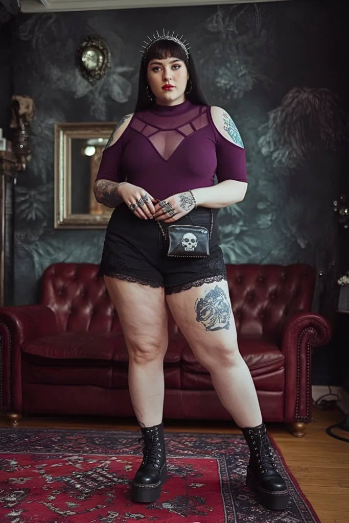 This outfit exudes gothic elegance with a touch of royal flair. The deep purple top with its intricate mesh design and cold-shoulder cut creates a hauntingly beautiful silhouette. Paired with black lace shorts and chunky platform boots, it strikes the perfect balance between edgy and alluring. The spiky crown headpiece adds a regal touch, while the skull-adorned purse brings in a classic goth element. Adorned with tattoos and statement rings, this look embodies the essence of fall goth fashion. The rich, autumnal color palette and mix of textures make it an ideal choice for those crisp October nights when you want to channel your inner dark queen.
