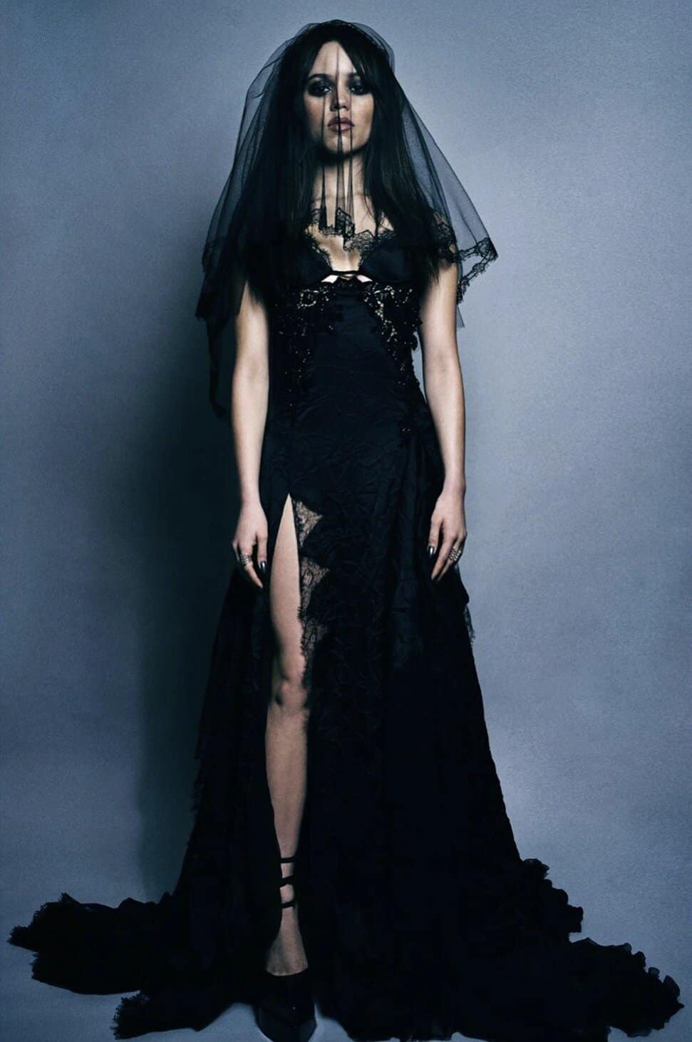 This mesmerizing ensemble embodies the epitome of gothic bridal elegance with a haunting twist. The floor-length black gown features intricate lace detailing and a daring thigh-high slit, exuding an air of dark romance. The plunging neckline adorned with delicate lace adds a touch of allure, while the sheer black veil draped over long, dark hair completes the ghostly bride aesthetic. This outfit is perfect for those seeking to channel their inner dark goddess this fall, whether for a themed event or a daring everyday look. The juxtaposition of bridal elements with gothic aesthetics creates a hauntingly beautiful ensemble that’s sure to turn heads and send shivers down spines.