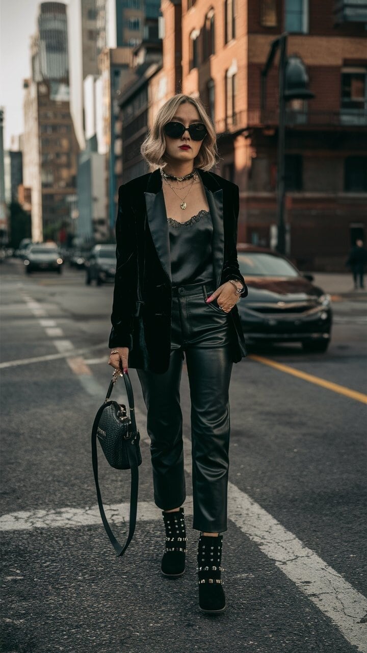 This ensemble epitomizes fall goth chic with its perfect blend of textures and dark allure. The centerpiece is a luxurious black velvet blazer, paired exquisitely with sleek leather pants that exude confidence and edge. A lace-trimmed satin camisole adds a touch of sensuality, while layered necklaces and statement sunglasses elevate the look with a hint of mystery. The studded ankle boots bring a rebellious flair, complementing the overall dark aesthetic. This outfit is ideal for those crisp autumn evenings in the city, allowing you to embrace your inner darkness while maintaining a sophisticated silhouette that’s hauntingly beautiful and undeniably goth.