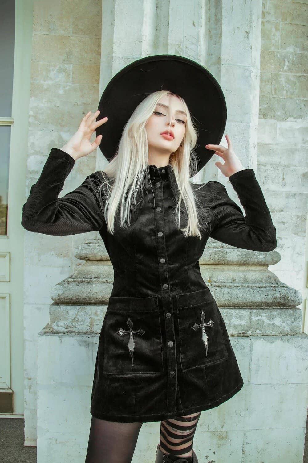 This hauntingly beautiful ensemble captures the essence of fall goth fashion with its all-black palette and bewitching silhouette. The centerpiece is a striking black velvet mini dress, adorned with silver cross embellishments that add a touch of mystical allure. The dress’s button-up front and long sleeves create a sleek, form-fitting look that’s perfect for cooler autumn days. Topped with an oversized wide-brimmed black hat, the outfit exudes an air of mystery and dark glamour. The contrast between the platinum blonde hair and the deep black attire creates a mesmerizing visual impact, while the striped tights add a playful yet edgy element to the overall look. This outfit is a stunning example of how to embrace the goth aesthetic while maintaining an air of sophistication and allure.
