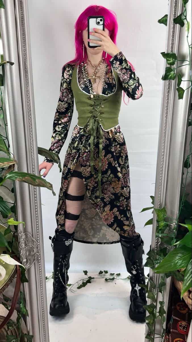 This enchanting ensemble perfectly embodies the spirit of fall goth fashion with its mesmerizing blend of dark romance and whimsical charm. The floral print dress in rich autumnal hues creates a hauntingly beautiful backdrop, while the olive green corset adds a touch of Victorian elegance. The daring thigh-high cutouts and chunky platform boots inject an edgy, modern twist to the look. Topped with vibrant magenta hair and adorned with layered cross necklaces, this outfit strikes an alluring balance between ethereal and rebellious. It’s a captivating choice for those seeking to embrace their inner dark fairy while celebrating the mystical allure of the fall season.
