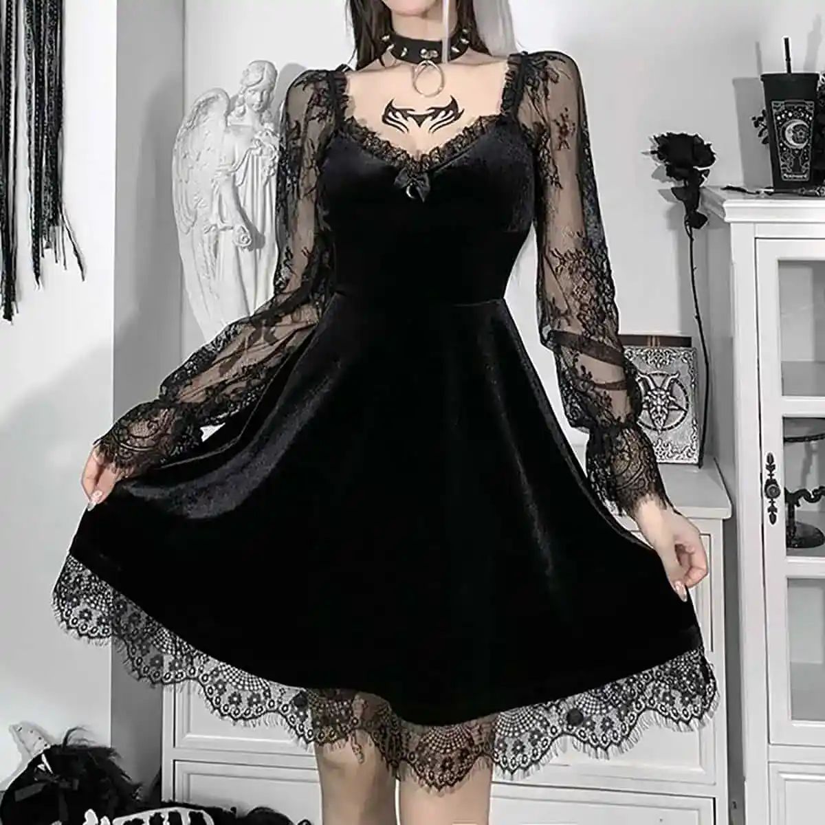 This hauntingly beautiful ensemble effortlessly captures the essence of fall goth fashion. The centerpiece is a sumptuous black velvet dress with a sweetheart neckline, complemented by delicate lace sleeves that add an air of Victorian romance. The dress’s full skirt, adorned with intricate lace trim, creates a mesmerizing silhouette perfect for twirling through autumn leaves. Accessories like the spiked choker and chest tattoo add edgy, modern touches to the classic gothic look. Set against a backdrop of occult-inspired decor, including an angelic statue and pentagram artwork, this outfit embodies the perfect balance of dark elegance and seasonal charm for any fall goth enthusiast.