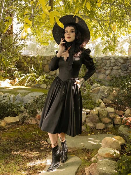 This enchanting ensemble captures the essence of fall goth fashion with its bewitching allure. The long-sleeved black dress, cinched at the waist and flaring into a full skirt, exudes vintage charm while maintaining a dark, mysterious edge. The wide-brimmed hat adds a dramatic silhouette, perfect for casting long shadows on crisp autumn days. Paired with edgy ankle boots, this outfit strikes a balance between classic witchy style and modern goth aesthetics. The autumnal backdrop of golden leaves enhances the seasonal appeal, making it an ideal choice for those seeking to embrace their inner sorceress while strolling through fallen leaves or attending a Halloween soiree.