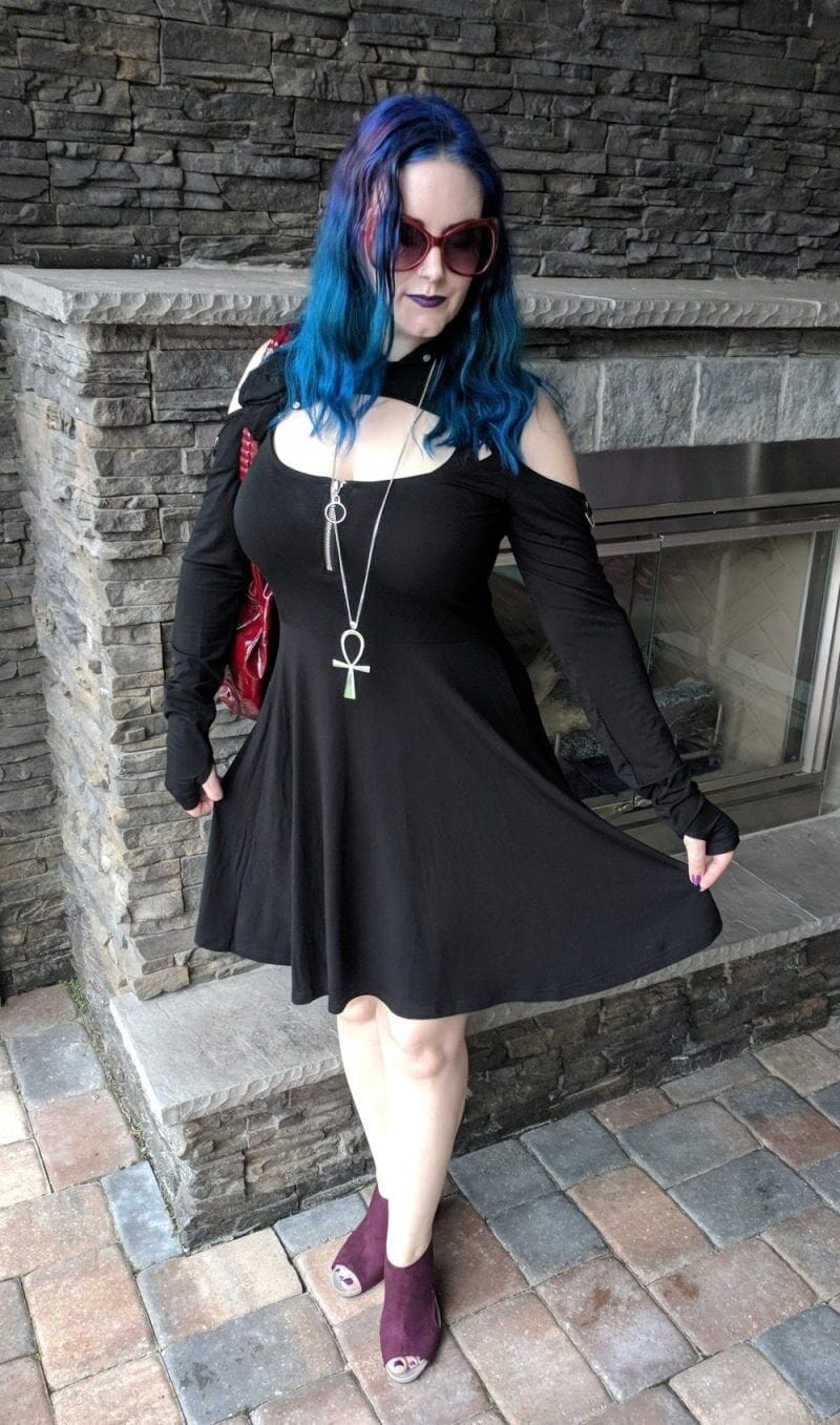This bewitching ensemble epitomizes fall goth fashion with its alluring cold-shoulder black dress. The flowing silhouette creates an air of mystery, while the cut-out shoulders add a touch of modern edge. Accessorized with a striking ankh necklace, burgundy peep-toe booties, and oversized sunglasses, this outfit seamlessly blends classic goth elements with contemporary style. The vibrant blue and purple hair provides a captivating contrast against the dark attire, infusing the look with a mesmerizing pop of color. Perfect for those crisp autumn evenings, this hauntingly beautiful outfit is sure to turn heads and cast a spell on onlookers.