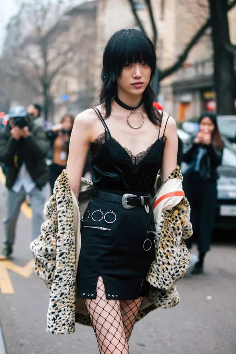 This ensemble masterfully blends goth aesthetics with high-fashion elements, creating a look that’s perfect for the fashion-forward fall goth. The foundation is a sultry black velvet and lace camisole, paired with a daring mini skirt adorned with metal rings and grommets. Fishnet stockings add a classic goth touch, while the statement leopard print coat introduces a bold contrast. The look is accessorized with a thick choker featuring a large metal ring, emphasizing the outfit’s edgy appeal. This combination of textures and patterns creates a hauntingly beautiful silhouette that’s sure to turn heads on chilly autumn nights. It’s a perfect example of how goth style can be both darkly alluring and fashion-forward.
