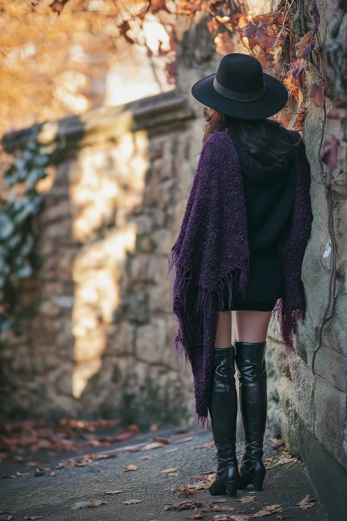 Embrace the melancholic beauty of autumn with this hauntingly chic ensemble. A rich, violet shawl with frayed edges drapes gracefully over a sleek black dress, creating a striking contrast against the golden fall foliage. The outfit is completed with sleek thigh-high boots and a wide-brimmed black hat, perfect for casting mysterious shadows. This look embodies the essence of fall goth fashion, combining dark romance with a touch of whimsy. The interplay of textures – from the fuzzy shawl to the smooth leather boots – adds depth and intrigue, while the autumnal backdrop of stone walls and fallen leaves sets a perfectly moody scene. It’s an outfit that commands attention while maintaining an air of enigmatic allure.