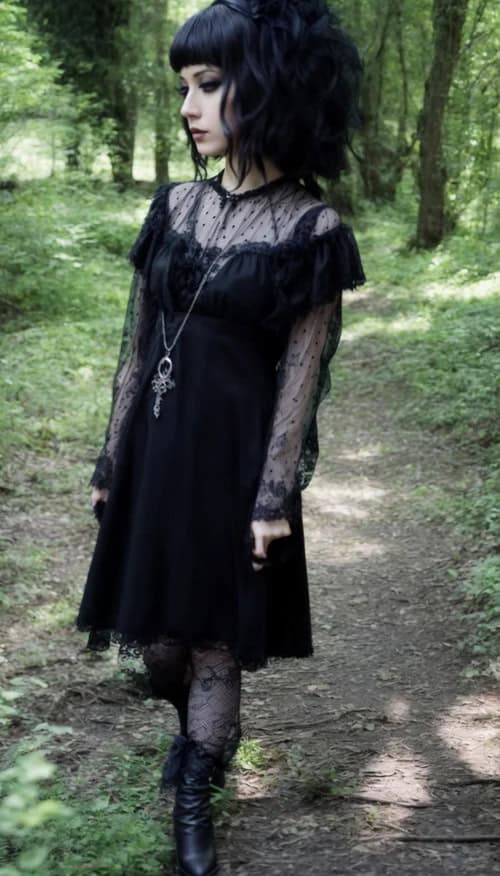 This enchanting ensemble epitomizes the essence of fall goth fashion, blending delicate darkness with woodland mystique. The sheer, polka-dotted sleeves and lacy details of the black dress create an air of Victorian romance, while the midi length adds a touch of modern sophistication. Paired with intricate patterned tights and sleek boots, this outfit is perfect for a haunting autumn stroll. The silver pendant necklace adds a mystical focal point, completing the look with a hint of occult allure. Set against the lush green backdrop of a forest path, this outfit captures the hauntingly beautiful intersection of nature and gothic aesthetics.
