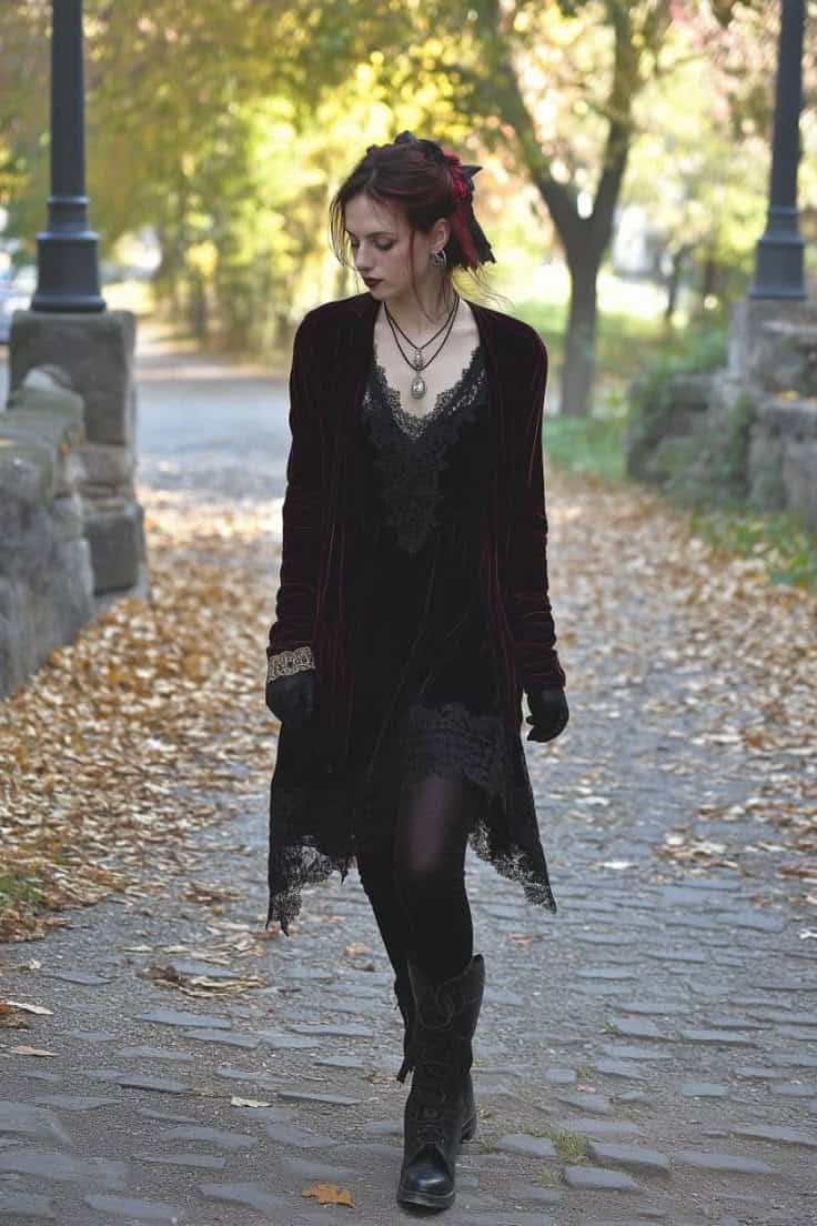 This enchanting ensemble perfectly captures the essence of fall goth fashion. A deep burgundy velvet cardigan drapes gracefully over a delicate black lace dress, creating a luxurious contrast of textures. The lace hem adds a touch of Victorian charm, while the chunky boots ground the look with edgy practicality. Accessorized with a ornate pendant necklace and a red ribbon hair accent, this outfit exudes a haunting beauty that’s ideal for crisp autumn days. The fallen leaves and stone pathway provide a romantic backdrop, enhancing the overall gothic aesthetic. This look seamlessly blends dark elegance with seasonal comfort, making it a must-have for any fall goth wardrobe.