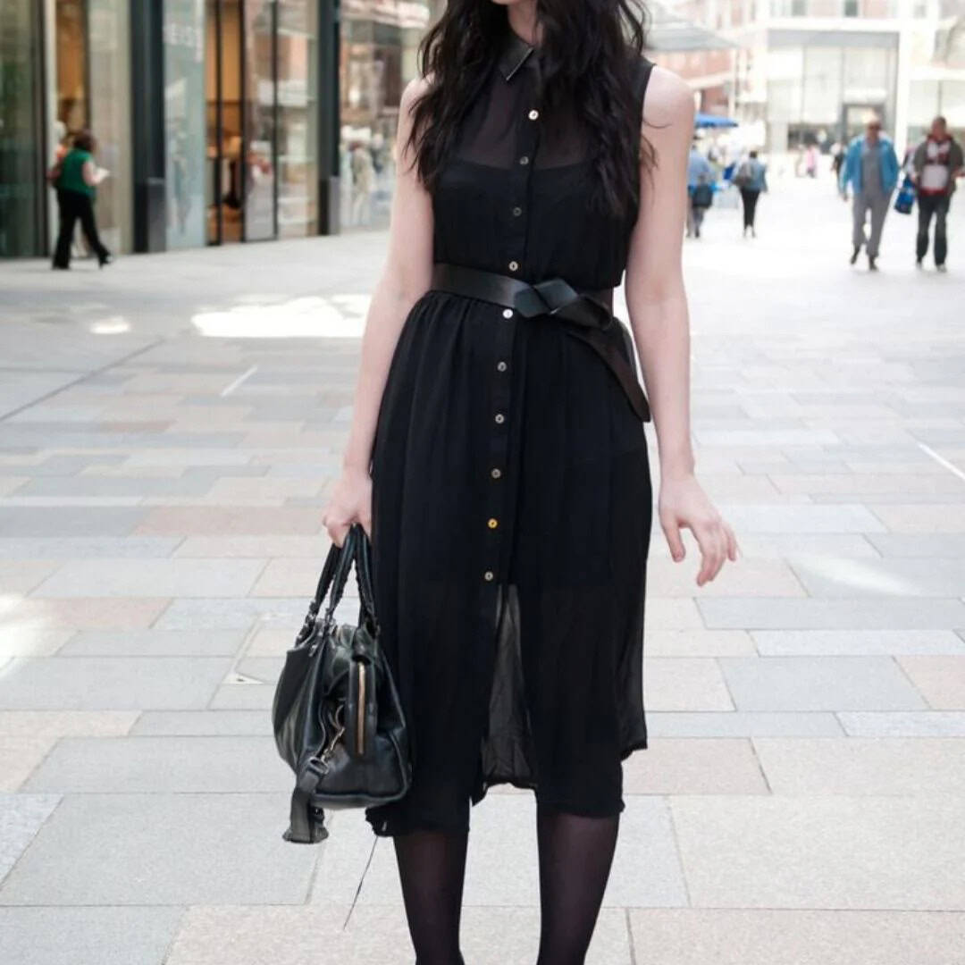 This hauntingly elegant black midi dress epitomizes fall goth fashion with its sleek silhouette and mysterious allure. The button-down front adds a touch of vintage charm, while the cinched waist with a bow detail creates a flattering hourglass shape. The sheer top layer adds depth and intrigue, perfect for those crisp autumn evenings. Paired with opaque black tights and a matching handbag, this ensemble exudes a sophisticated darkness that’s both alluring and seasonally appropriate. The flowing skirt allows for dramatic movement, evoking images of swirling autumn leaves. This versatile piece can easily transition from day to night, making it a must-have for any goth-inspired fall wardrobe.