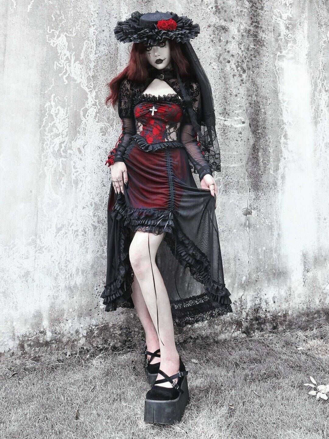 This haunting ensemble perfectly embodies the dark romanticism of fall goth fashion. The striking combination of deep red and black creates a mesmerizing contrast, while the intricate lace detailing and ruffled accents add a touch of Victorian elegance. The corset-style top with a bold cross embellishment nods to gothic symbolism, while the high-low skirt with its dramatic train adds movement and mystery. Topped with a statement hat adorned with a blood-red rose and paired with edgy platform shoes, this outfit seamlessly blends historical influences with modern goth aesthetics. It’s an ideal choice for those seeking to make a dramatic entrance at any autumn gathering or Halloween soirée.
