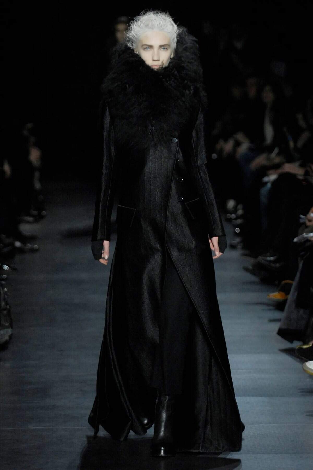 This ensemble epitomizes the essence of fall goth fashion with its dramatic floor-length black coat. The garment’s silhouette is both commanding and graceful, featuring a fitted bodice that flares into a sweeping skirt. The coat’s luxurious texture hints at a mix of leather and velvet, perfect for crisp autumn nights. A standout element is the voluminous black fur collar, evoking images of a raven’s plumage and adding an air of Victorian Gothic romance. The stark contrast between the model’s pale complexion and white hair against the all-black attire creates a hauntingly beautiful aesthetic. This look is ideal for those seeking to channel their inner dark queen as they stride through fallen leaves on moonlit evenings.