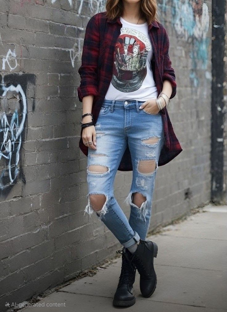 Paired with light-wash distressed jeans sporting strategically placed rips, the look embodies the carefree, rebellious spirit of grunge. The outfit is completed with chunky black boots, adding a touch of punk attitude.